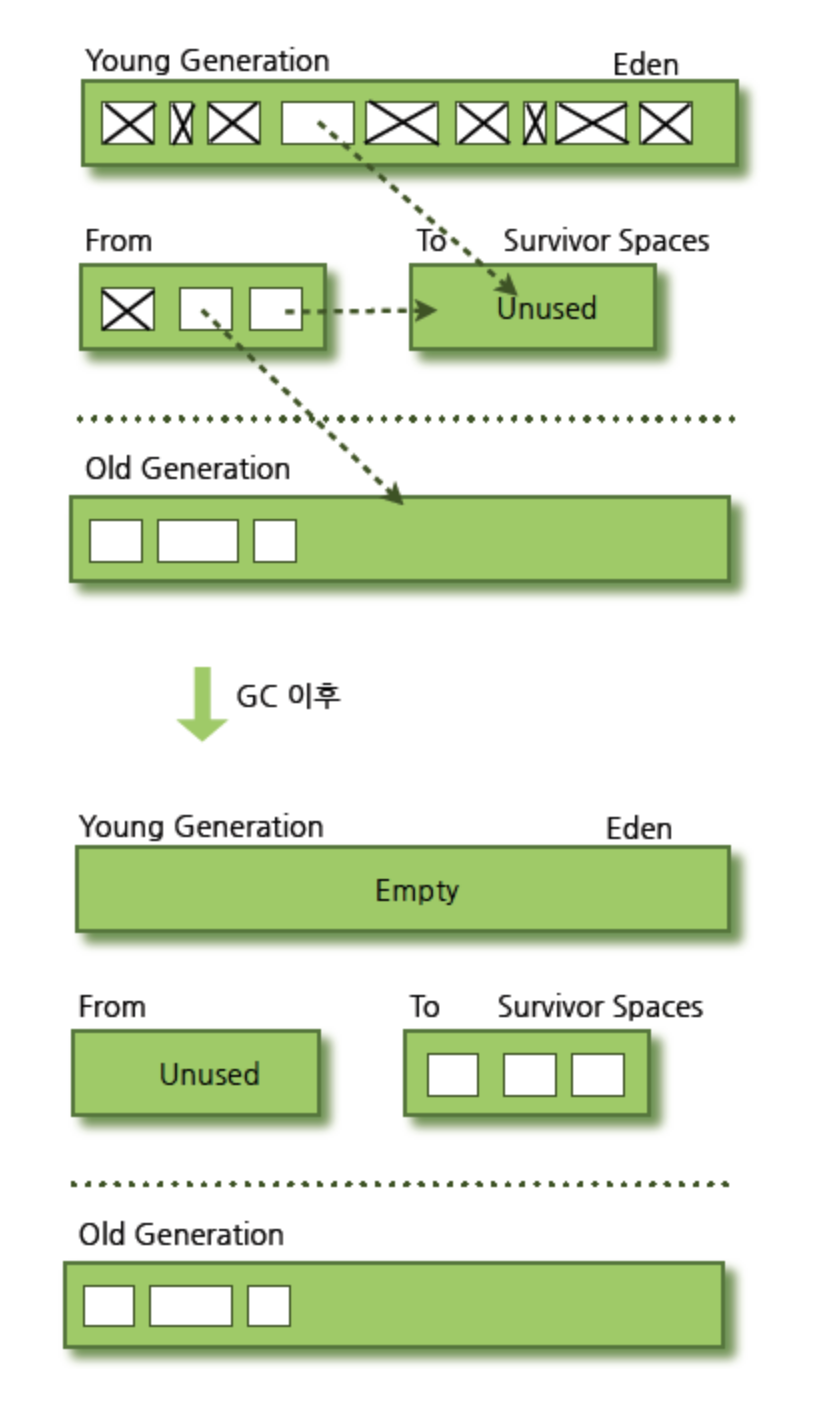 - Eden 영역에서 GC가 한 번 발생한 후 살아남은 객체는 Survivor 영역 중 하나로 이동된다.