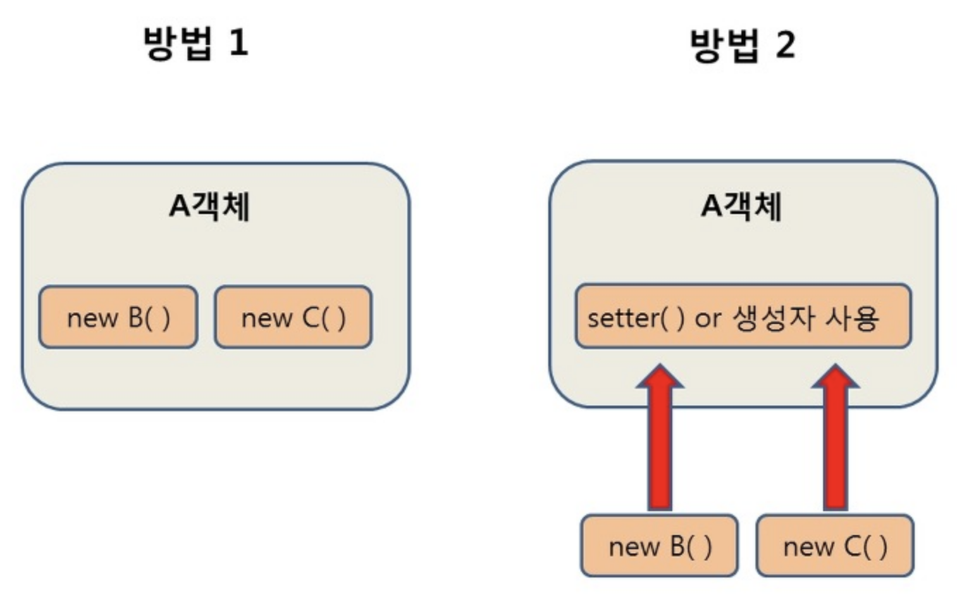첫번째 방법은 A객체가 B와 C 객체를 New 생성자를 통해서 직접 생성하는 방법이고, 두번째 방법은 외부에서 생성된 객체를 setter()를 통해 사용하는 방법입니다.
