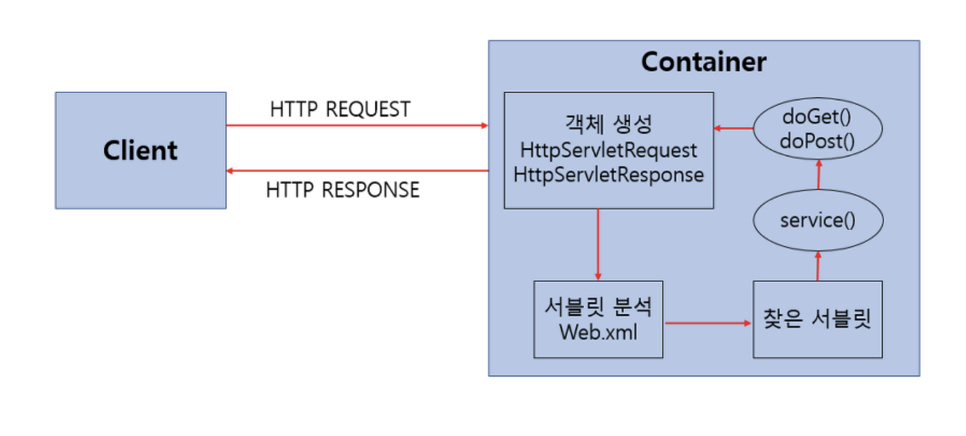 - 사용자(클라이언트)가 URL을 입력하면 HTTP Request가 Servelt Container로 전송합니다.