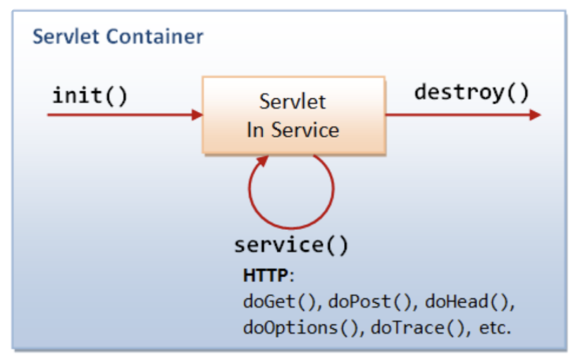 1. 클라이언트의 요청이 들어오면 컨테이너는 해당 서블릿이 메모리에 있는지 확인하고, 없을 경우 init() 메소드를 호출하여 적재합니다. init() 메소드는 처음 한번만 실행되기 때문에, 서블릿의 쓰레드에서 공통적으로 사용해야 하는 것이 있다면 오버라이딩하여 구현하면 됩니다. 실행 중 서블릿이 변경될 경우, 기존 서블릿을 파괴하고 init()을 통해 새로운 내용을 다시 메모리에 적재합니다.