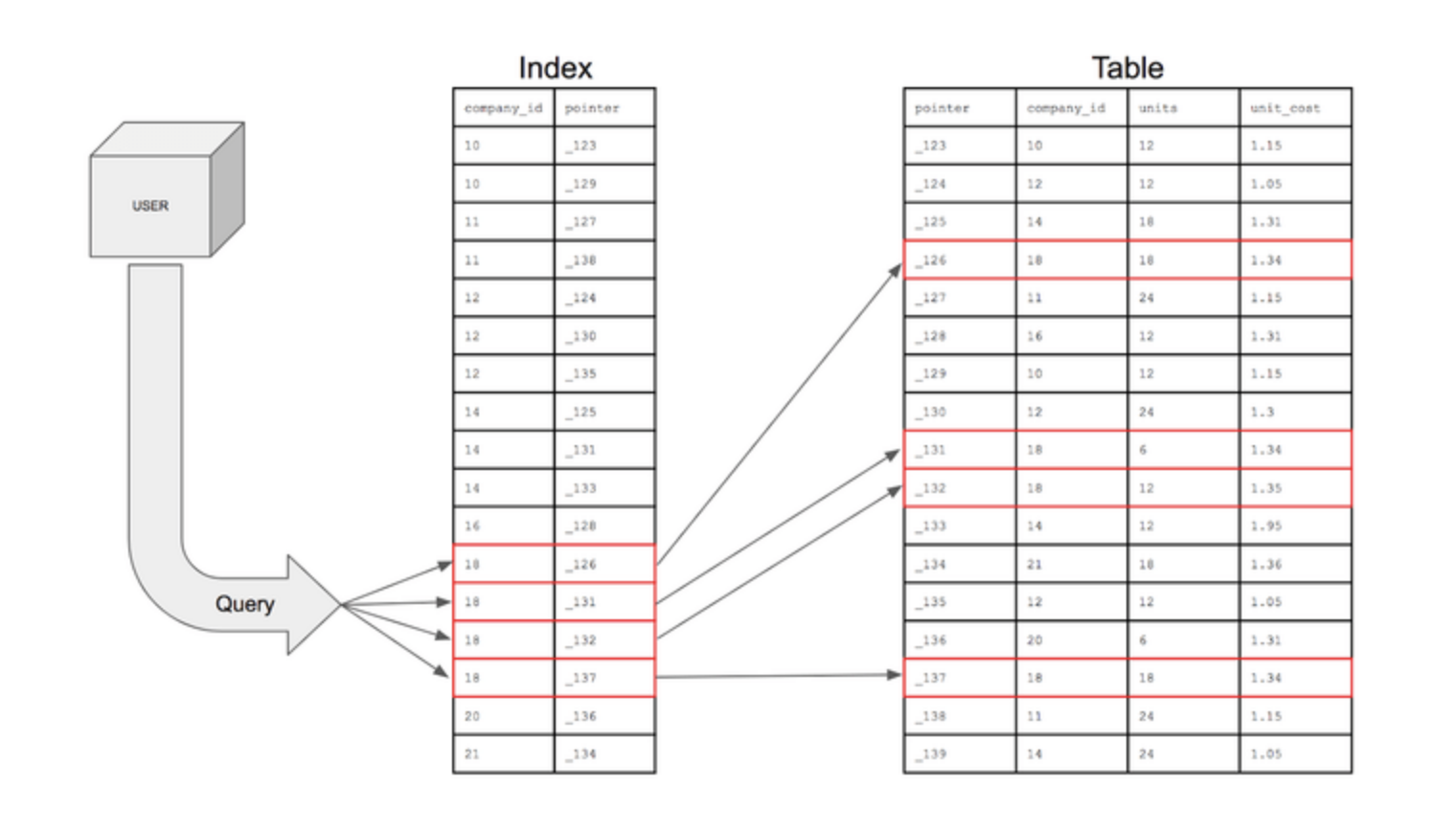마찬가지로 테이블에서 원하는 데이터를 찾기 위해 인덱스를 이용하면 빠르게 찾을 수 있습니다.