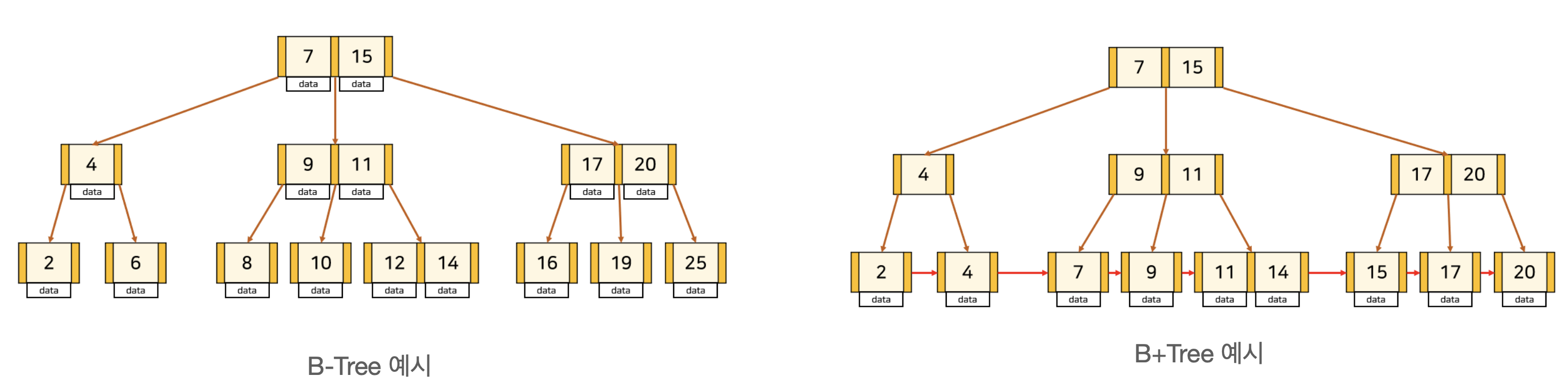 또 B+Tree 에서는 반드시 leaf node에만 데이터가 저장되기 때문에 중간 node에서 key를 올바르게 찾아가기 위해서 key가 중복될 수 있습니다.