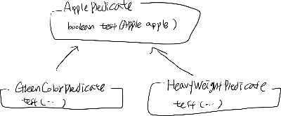 List<Apple> greenCololrApples = filterApple(inventory,new AppleGreenColorPredicate()); // 초록색 사과만 필터링 하도록 test메서드가 정의된 AppelPreicate 객체를 전달