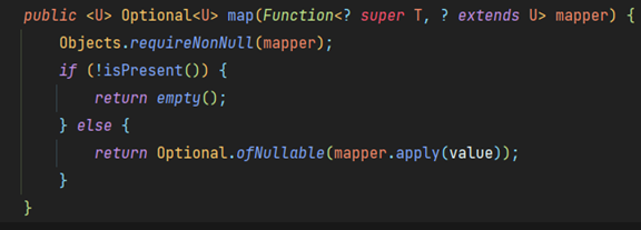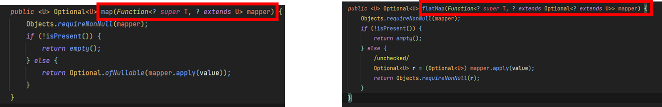 map()에서는 제너릭으로 U를 정의 했지만 flatMap() 에서는 제너릭으로 Optional(U)를 정의 하였습니다.